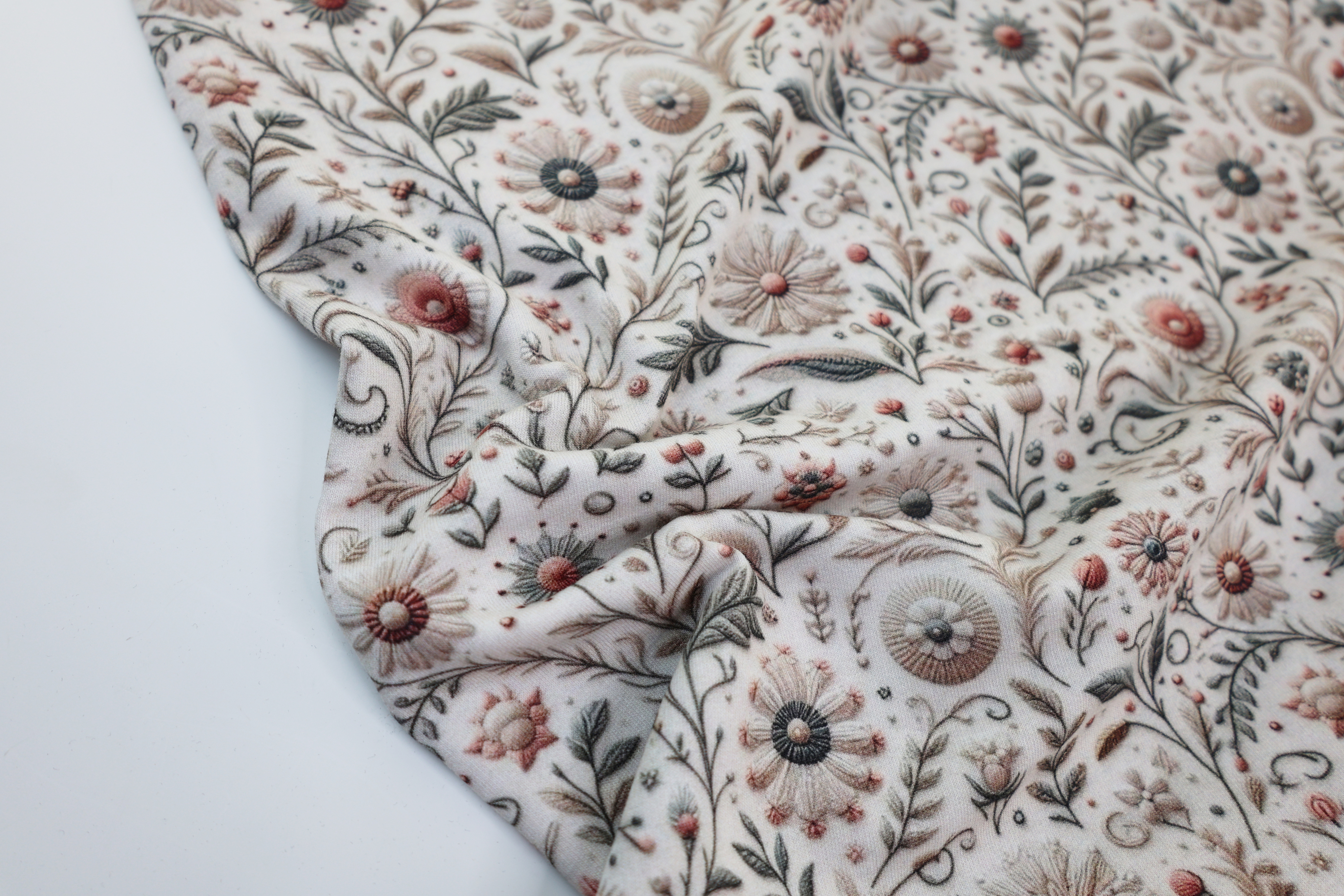 ВЫШИТЫЕ ЦВЕТЫ НА КРЕМОВОМ - Футер 2х-нитка с лайкрой, компакт пенье (ДЖ69 Маша)